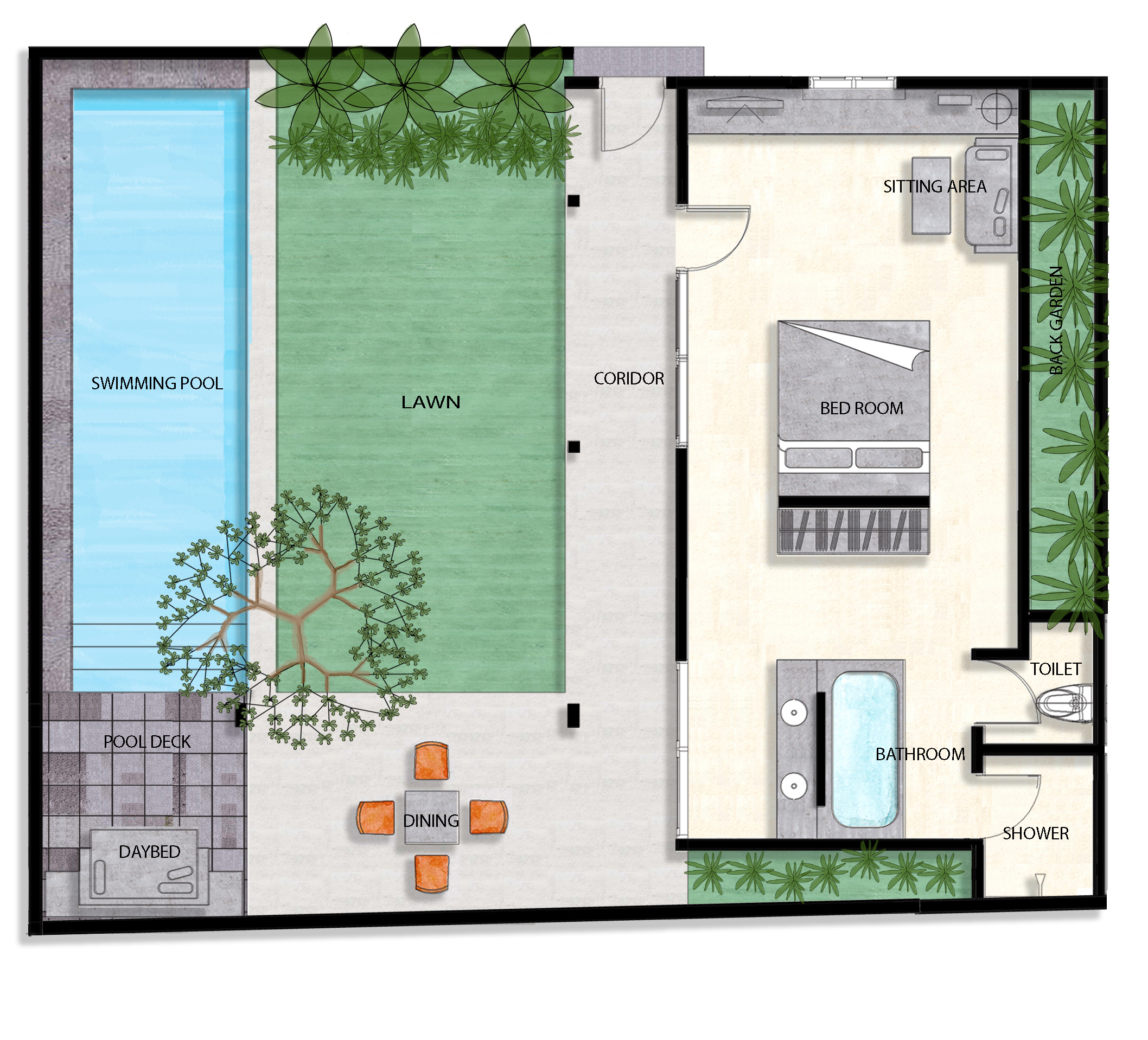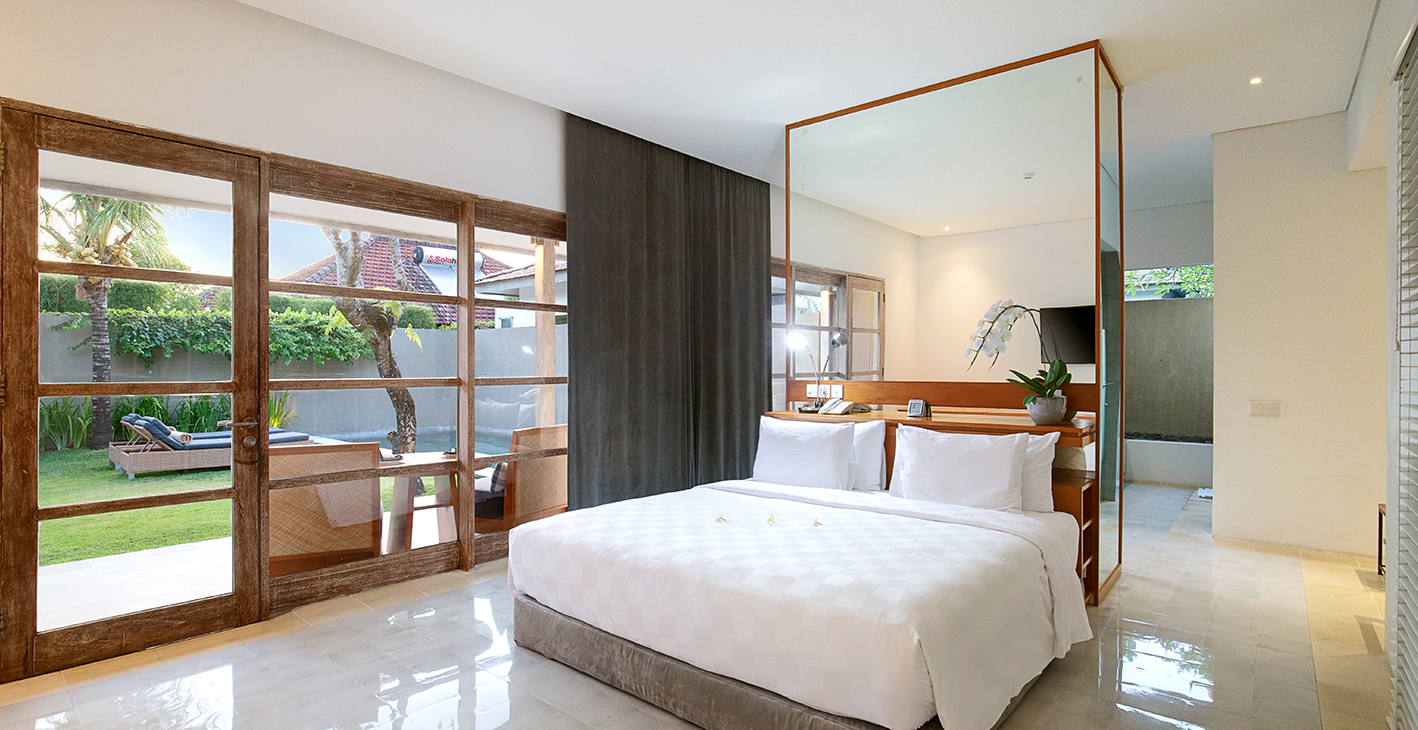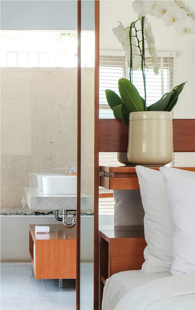 A villa made for two, with space to stretch, slow down, and savour the quiet. Inside, a king-size bed, soft sofa, and private daybed invite long mornings and unhurried nights. The ensuite bathroom is built for lingering, with dual vanities, a soaking tub, and garden views you’ll want to keep to yourselves. Step outside to your private 7-metre pool, book a spa or a romantic table for two and linger. It’s romantic, relaxed, and entirely your own.