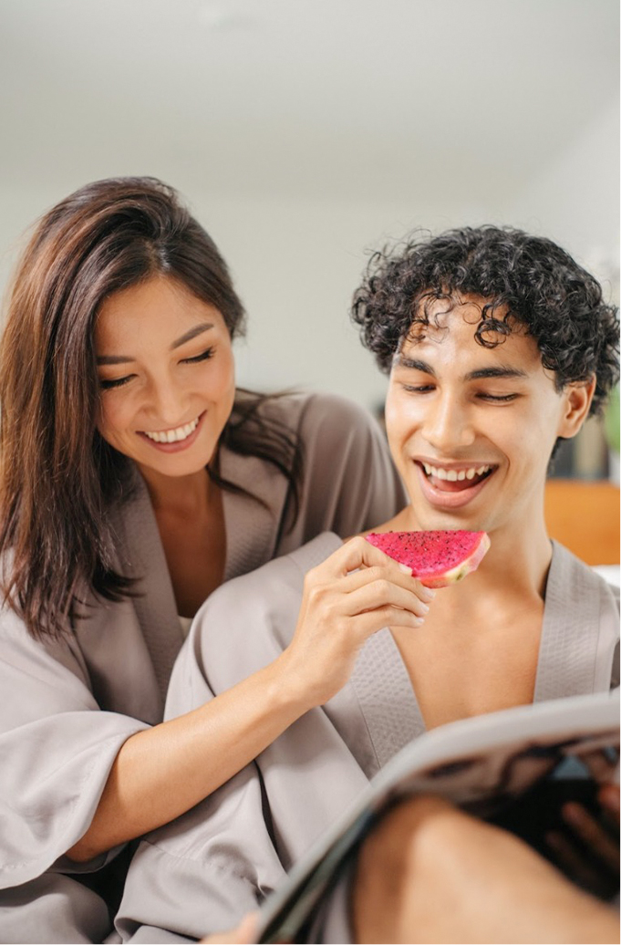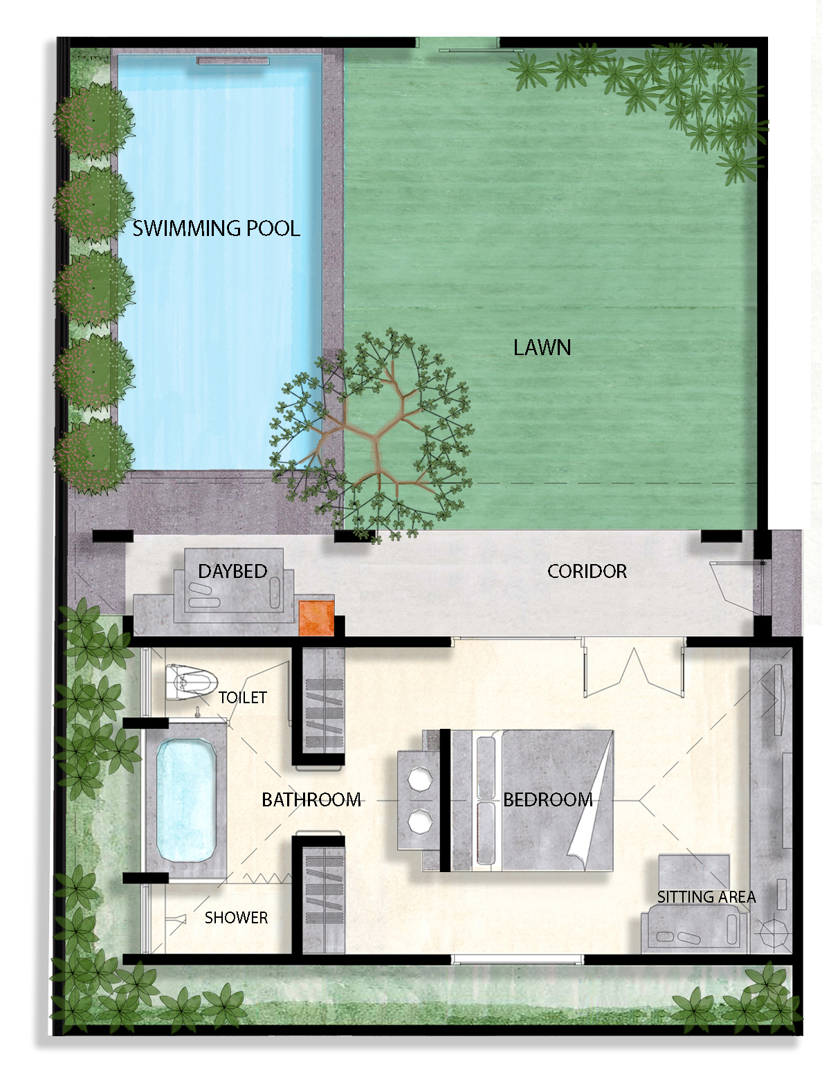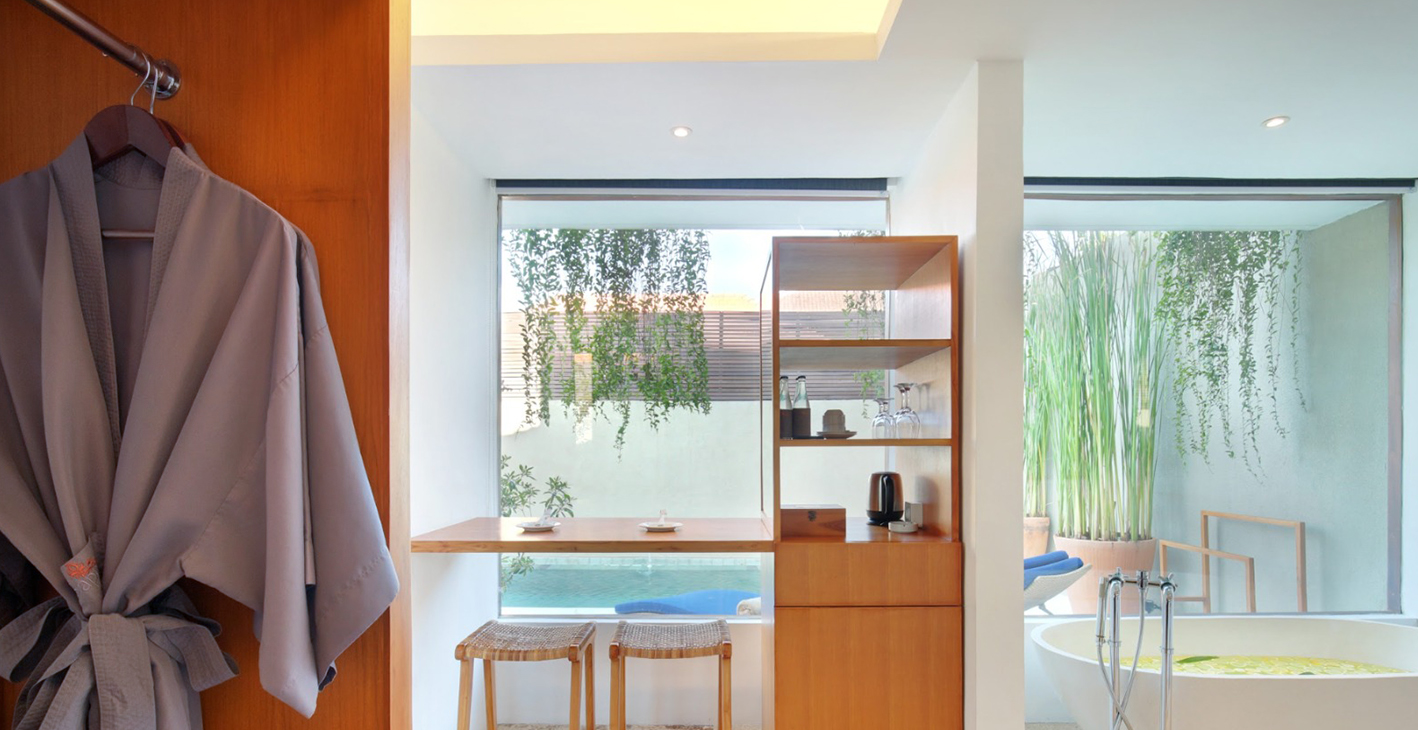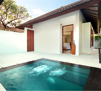 Soft curtains catch the morning light, casting patterns across a bed so comfortable you’re tempted to sleep in. Step into a generous walk-in bathroom, rinse off the world, and wander barefoot to your private pool, smiling at the brilliant bougainvillaea. Palm trees whisper Bali stories. Breakfast can wait, there’s breathing to do. This is your sanctuary, designed for rest, stillness, and a little quiet luxury, your way.